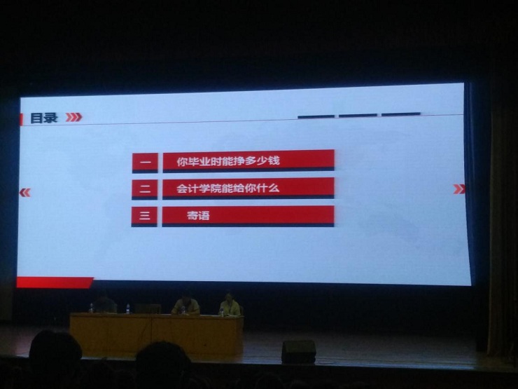 活动第一项,由张欣院长向学院全体新生做报告。张院长就三个方面进行了详细而扎实的说明,她从我校近年来的就业数据分析入手,以我院近年来的优秀校友为榜样,介绍了我院各个专业的就业形势以及薪资待遇,提高了学生对于选择本学院本专业的信心;其次,张院长分析了我院的师资力量,介绍了各项实验室以及实习实训基地的建设情况,从具体的方面为新生解答了“郑州升达经贸管理学院能给你什么”;最后,张院长通过传达大四学长学姐寄语、四年学习任务安排、老师寄语等表达了对郑州升达经贸管理学院新生的殷切希望,鼓励他们要做优秀的“会计人”。