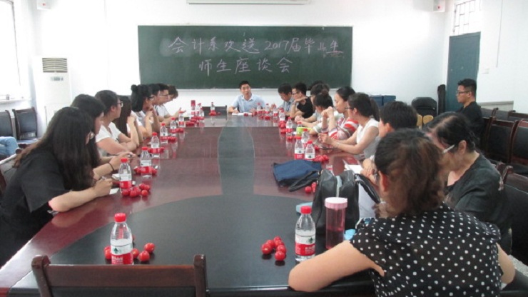 夏日凉凉,微风习习。5月31日上午9:30,会计系在教学1号楼114会议室召开了欢送2017届毕业生师生座谈会。到场的嘉宾有:会计系副主任范新安博士、会计系行政秘书兼团委书记陈刚老师、会计系行政秘书刘锦老师,教师代表邵葵老师、蒲敏老师、杨南老师,以及2017届31位优秀毕业生代表。