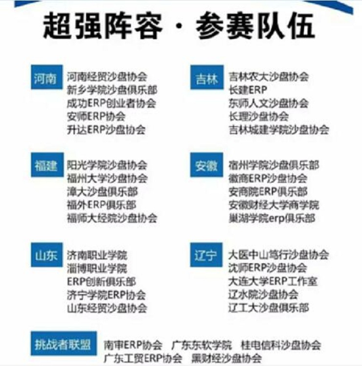 本次参加新道商战联盟超级联盟——超级联赛的共有全国七个联盟35所高校代表队,这些参赛高校是经过每个省联盟内部层层选拔脱颖而出的。