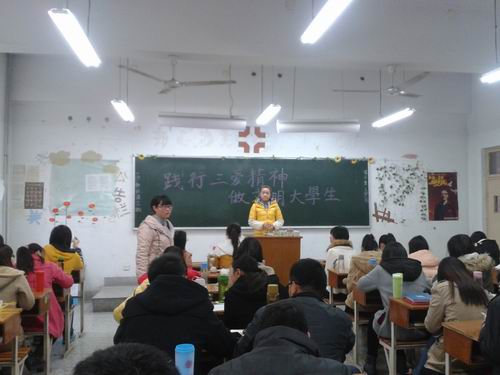 为提高大学生自身素质,积极响应学院号召,2013年11月21号下午2点,会计系学生第六党支部的各个班级在辅导员老师的带领下,在各班的主教室开展了以“践行“三爱”精神,做文明大学生”为主题的教育活动,各班同学都积极参加。