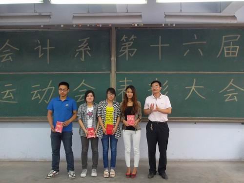 5月30日下午2:00,会计系在教学一号楼111室举行了“会计系第十六届运动会表彰大会”,出席此次会议的领导有会计系党总支朱建良书记,副书记张红阳同志,会计系行政秘书兼团委书记陈刚老师,行政秘书刘锦老师,2012级全体辅导员老师以及我系全体运动员和部分团学会成员。