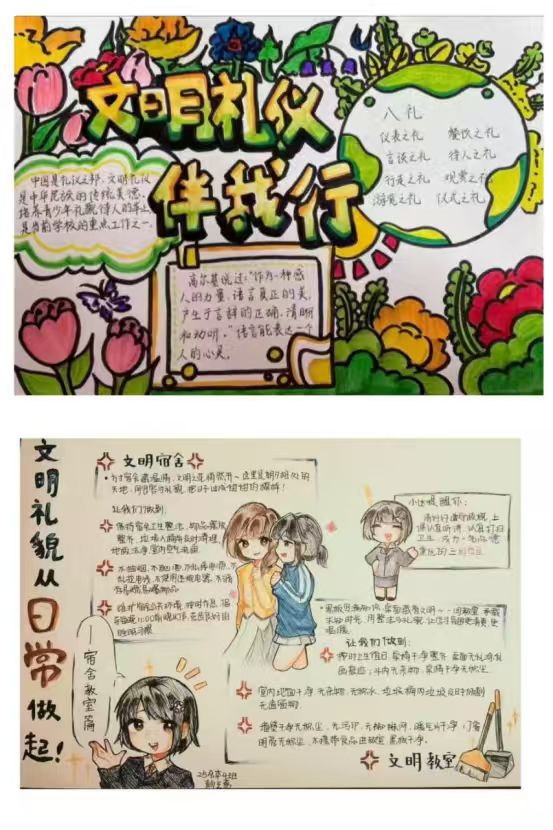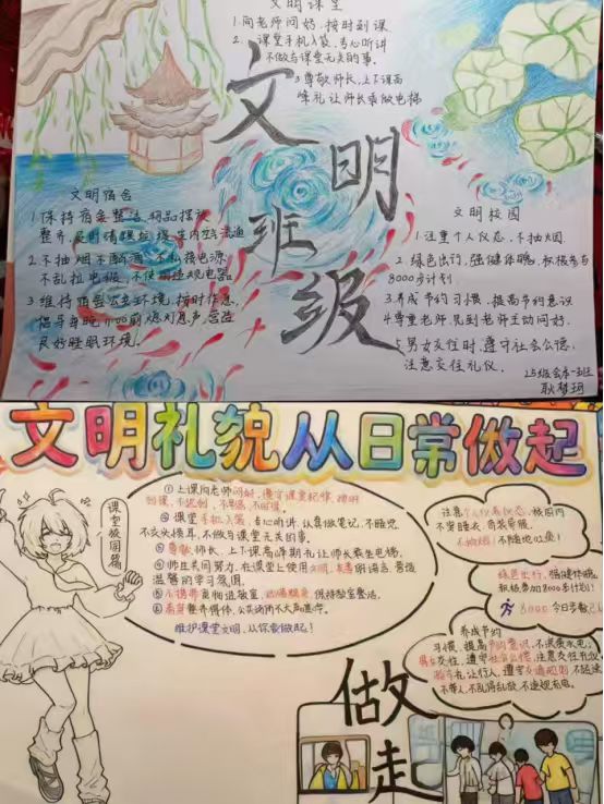 一张张精心绘制的手抄报,不仅展现了同学们扎实的绘画功底和独特的创意,更传递出对文明校园的美好向往。有的作品用醒目的警示图案和文字,呼吁大家杜绝不文明行为;还有的作品通过温馨的漫画,倡导同学们共同维护宿舍的整洁与安宁。每一份作品都主题鲜明、图文并茂,字里行间充满了对建设文明校园的热情与决心。